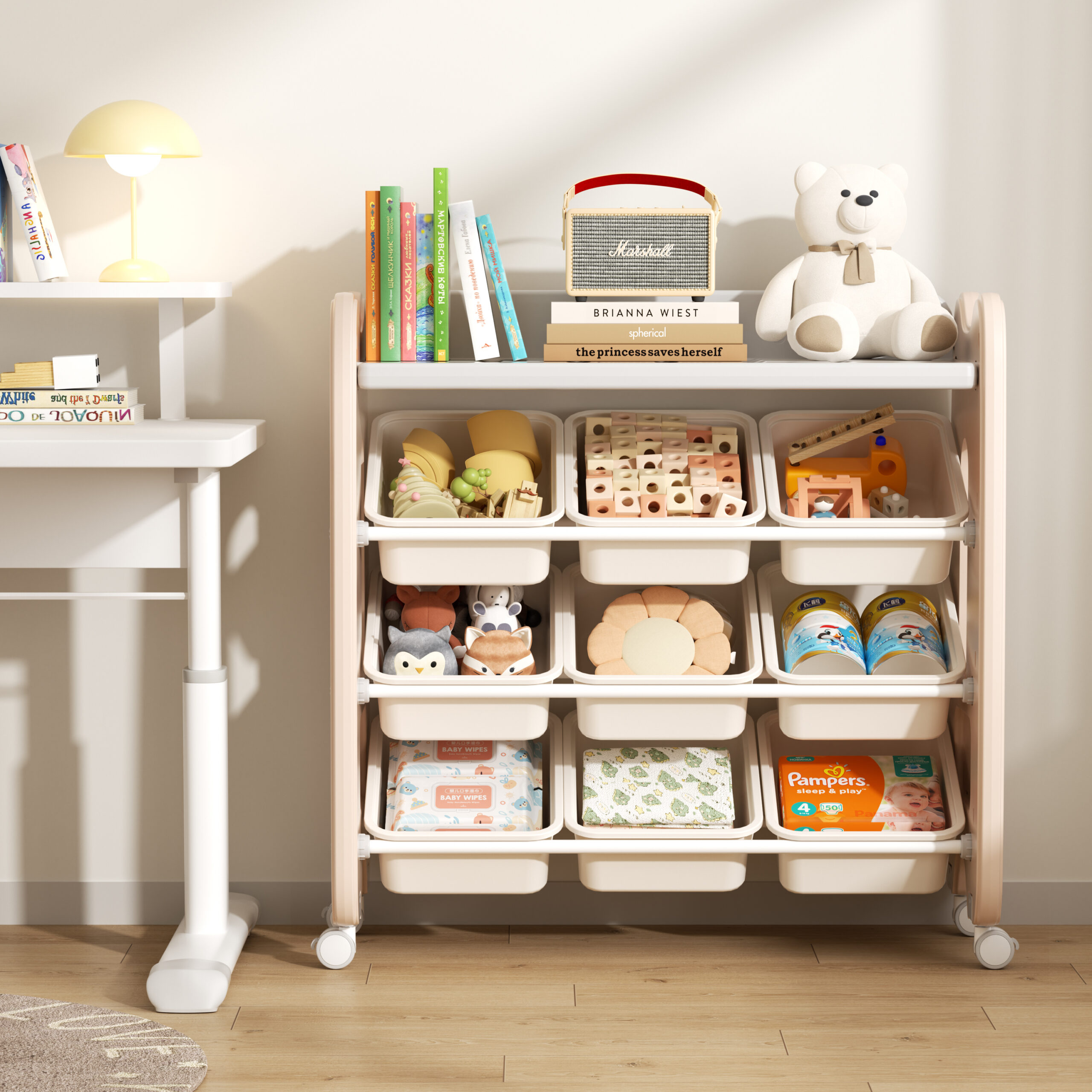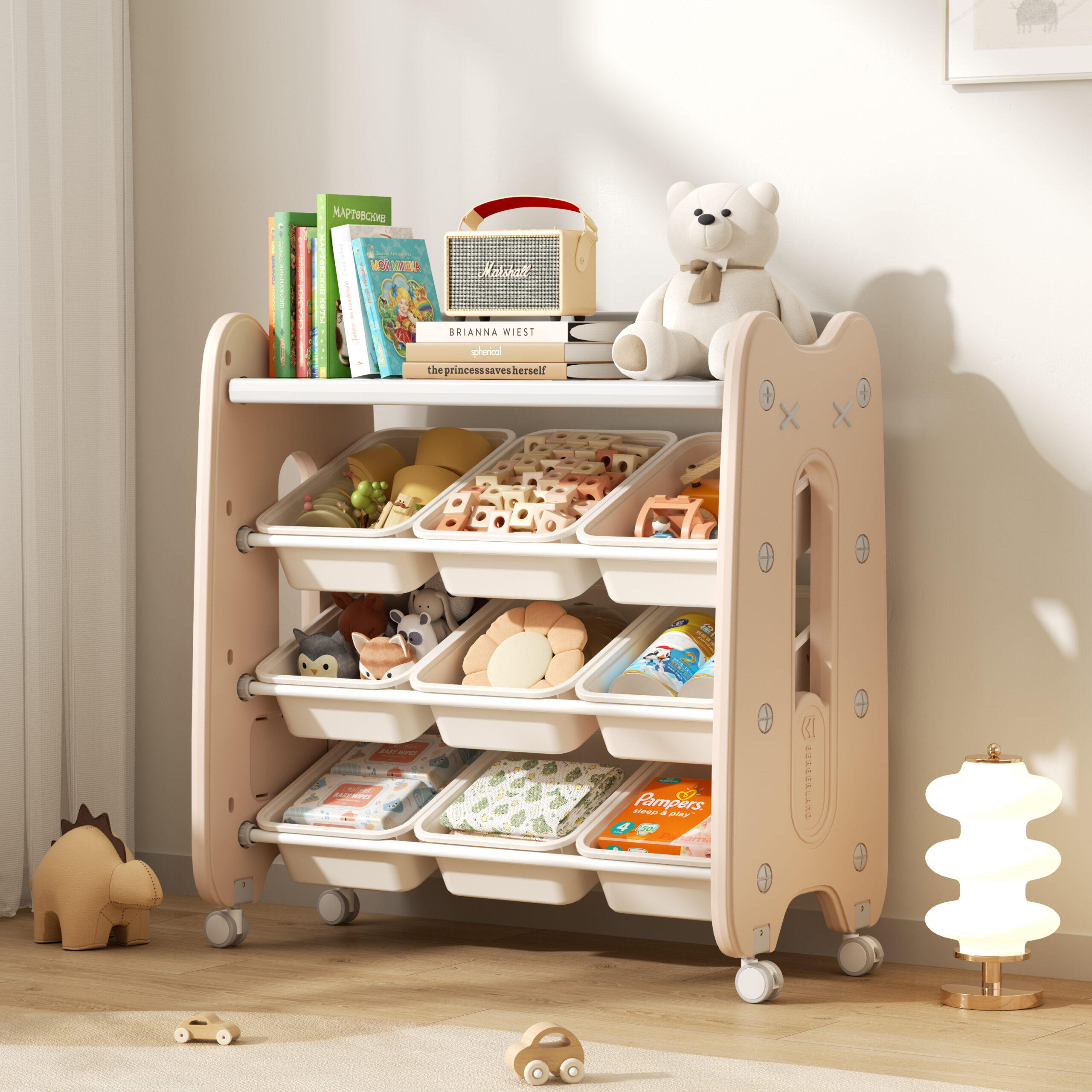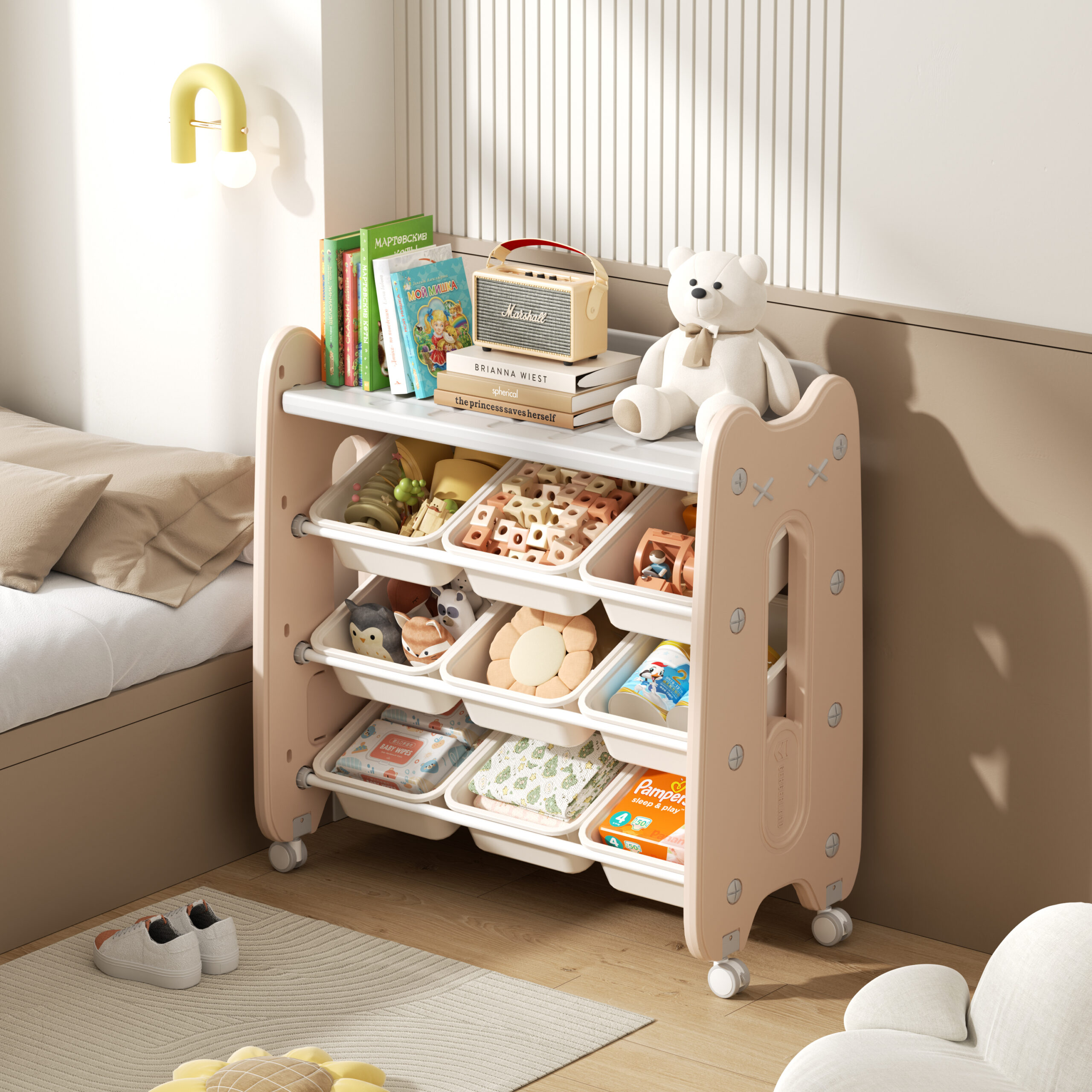 9 Removable Storage Bins + 1 Shelf – Perfect for toys, books, and everyday essentials
